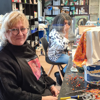 Dino and his Assistant Silvia came to my studio to work with us again. We used cotton cloth that we prepared to make it stiff. After that we learned to use Smalti in a specific way so the finished piece looked like fabric. Hope you enjoy the fotos. Due to the pandemic we were a small group and distanced while working.